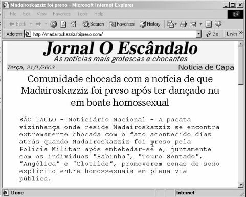 Uma página que faz graça com a difamação é o "Foi preso ", um site que brinca com tal situação: o sujeito recebe um email com o assunto "Sua privacidade está na internet". Vai ler, aparece o texto que o personagem (fictício) Madairoskazziz receberia: