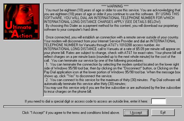 Em algumas páginas é necessário fazer o download de um programa que acelera a conexão. Já aconteceu com você? Pois é. Só que o programa tem uma espécie de contrato, que deve ser lido antes de você ter acesso aos "filmes pornô gratuitos", ele pede que a conexão seja feita de um provedor específico. Para ser mais exato, numa conexão fora do país onde você se encontra. Já ouviu falar da Moldova? E das Ilhas Caimãns? Madagascar. Pois é. Mas a culpa será só sua, por que você não leu o contrato. No contrato fala-se claramente que esse acesso é via um provedor lá longe de você e que haverá uma taxa cobrada na sua conta telefônica. Coisa de US$ 250,00 por cerca de meia hora. Mas quem é que passa meia hora navegando na internet em site pornô? Toma cuidado com esses sites. Se você não tem paciência para ler os contratos daquilo que está fazendo download, melhor não fazer. Por que esses programas são piores do que Trojans. Se um cavalo-de-tróia formatar seu HD, você terá que pagar um técnico. Mas se o programa ligar para as Ilhas Caimãns, você terá que pagar a empresa telefônica ou perder a linha. Na figura abaixo, temos um exemplo de chamada para Vanuatu, pagando US$5.09 por minuto.
