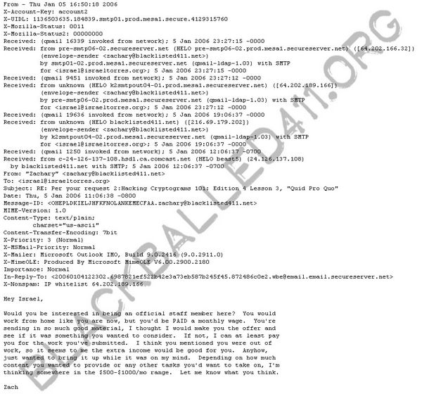 Blacklisted! 411 .NET Magazine - Issue #4 January 16, 2006 [1] Introduction: 2006 Updates [2] Edition Quote [3] Articles [a] Hacking Cryptograms 101 - by Israel Torres [b] Team ICE & The Elusive XBox 360 Mod Chip - by Ustler [c] Communication: Coded Conversation - by Israel Torres [4] Cryptogram [5] Favorite Photo [6] Credits
