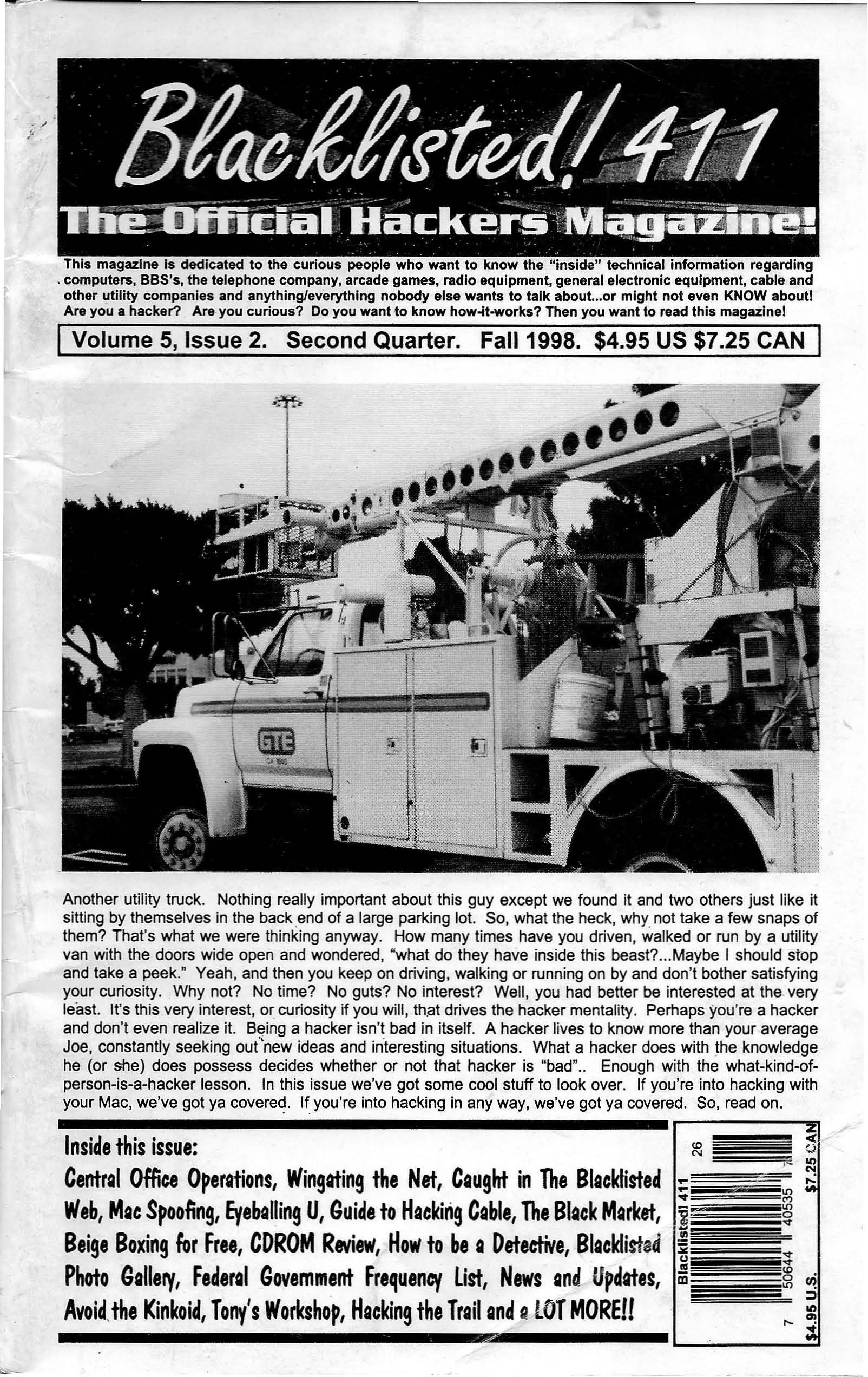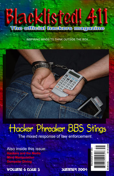 In 1999, we published what was to be our last issue of Blacklisted! 411 (Volume 5, Issue 4) for many years to come. We didn't know it at the time, but many pitfalls would ultimately cause the demise of the magazine. After 4 years of regrouping and planning, Blacklisted! 411 magazine is back in print form again. We are one of the oldest group of hackers still remaining and releasing gathered and compiled information within the hacker community and the mainstream community as well. We still have the same hacker mentality and code of ethics from the 80's. Hackers are not thieves - they're curious people. We are not elitist hackers by no means and no question is a stupid question. We're not going to knock you down, call you a "lamer," "lamah," or give you crap for being a newbie! Every hacker started somewhere. We remember this most fundamental fact and we will never forget it.