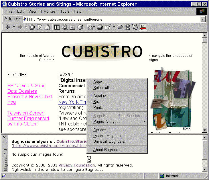 Bugnosis runs a battery of tests on each suspicious graphic on a Web page when you first open it. If the program finds a possible Web bug, it alerts you with a sound ("uh-oh!") and gives you some details about the Web bug in a little window. It also makes visible the Web bugs hidden on the page, so you can see where they are placed.