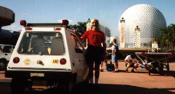 Richard Cheshire with the electric car he drove at the 1997 Sun Day Challenge hosted by Epcot Center and The Florida Solar Energy Center |