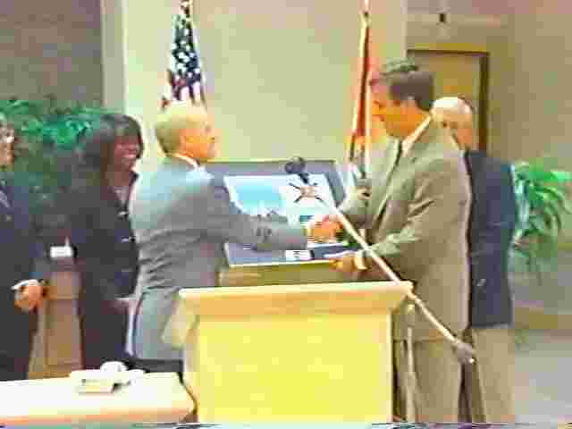| Kennedy Space Center Director Roy Bridges (left) is seen here over the shoulder of PSC Commission Chairman Joe Garcia. | Governor Bush praises Ozzie's "Simple, bold idea to reccognize Florida's Space Industry with this Area Code". |