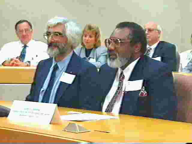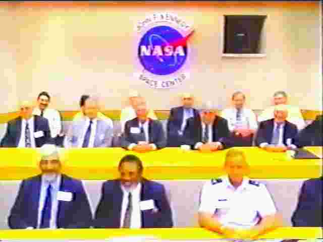 | View of the KSC Teleconferencing room, as seen in Tallahassee. | Robert Osband (left), originator of area code 321, with Kennedy Space Center Deputy Director James Jennings (right). NASA Photo |