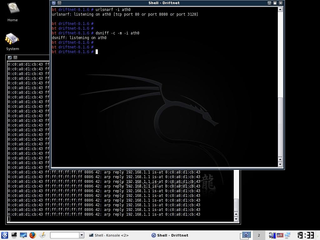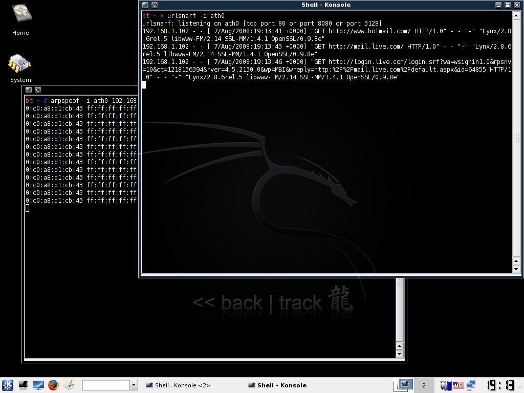 Step 1: Tell the kernel to enable IP fowarding. Boot up Backtrack and connect to your wireless network. Before you start sniffing anything, you need to enable IP fowarding on your computer. This is a critical step in the process because it will allow you to intercept data that is intended for other clients, inspect it, then pass it to the destination. Basically, you will be tricking the wireless router into showing you the packets first, then your computer will pass them to their intended destination. (Man-in-the-middle attack) "echo 1 > /proc/sys/net/ipv4/ip_forward" ### enable IP forwarding in the Linux kernel. Once you changed the value to enable IP fowarding, you can cat the result to ensure you did it correctly. Complete status should indicate a 1. Step 2: Spoof some ARP requests to trick other clients that may be connected to the target access point. Now that your computer is configured to forward any traffic, you can pass ARP requests and trick other clients into divulging their data. Normally an access point would only pass traffic intended for you to the MAC address assigned to your own card. Trick the other clients into thinking that your computer is actually the access point and show you all their traffic. You can use the "arpspoof" tool that comes with the dsniff toolkit to accomplish this. Be sure to leave this terminal window open, so the spoofed ARP requests are constantly broadcasting. "arpspoof -i ath0 192.168.1.1" ### where ath0 is your network interface and 192.168.1.1 is the IP address of the access point. Once arpspoof is running, be sure to leave the terminal window open. As the network is flooded with fake requests claiming that the MAC address of your computer is actually the wifi access point, you will be able to intercept data. Step 3: Start sniffing. Let's try inspecting some URLs being viewed first. Using additional tools that come with the dsniff toolkit, you can start inspecting HTTP traffic that is flying by. You have many options available to you, one of them being the urlsnarf tool. Start running urlsnarf and watch traffic being browsed in real time. Each time a user on the network requests a website, urlsnarf can capture that request and display which site is being requested. "urlsnarf -i ath0" ### where ath0 is your network interface. In the example screenshot, you can see the ARP spoofs being broadcasted in the background, while url snarf captures data. It would appear that one of the "victims" on the network is going to check out hotmail. The target computer that is being watched probably has no idea their traffic is being redirected, unless they are using a tool to detect fake ARP requests, or actively running a packet sniffer. Step 4: Continue sniffing. Let's try inspecting some images that are being pulled up by clients. Backtrack comes pre-equipped with driftnet, which is a tool that can grab a copy of images which are being requested by clients. This is particularly fun, because you can visually see things that the "target" is seeing. In the given example, myspace.com and tmz.com was loaded and the resulting images are picked up and displayed in the window. "driftnet -i ath0" ### where ath0 is your network interface. You can see the result of images being picked up by clients that are browsing the web. Our ARP spoof pcakets are still being broadcast in the background, while driftnet picks up interesting data. As the "target" loads up their myspace page and tmz.com, you can see pictures that are embedded in the webpage being served up in real time. Amuse your friends and roommates to no end with this fun. Step 5: Continue sniffing. See if you can capture a password. The primary tool that comes with the dsniff kit is dsniff itself. This tool is capable of capturing passwords for a multitude of different protocols as they are plugged into various services such as web forms, irc, instant messenger clients and more. For obvious reasons, no passwords are shown in the example screenshot, but as you sniff the traffic on your own LAN, try logging into some of your favorite services and watch the passwords come rolling in. "dsniff -c -m -i ath0" ### where "-c" tells dsniff to capture data that is being captured from ARP spoofing, "-m" tells dsniff to automatically guess the protocol being sniffed, and ath0 is your network interface. Another option that is available to you besides urlsnarf and dsniff would be msgsnarf, a tool designed to capture (specifically) chat conversations from your favorite instant messenging tools. If you have roommates or friends that use your network, immagine the fun when you snoop their conversations and mess with them. Conclusions: As you can see, sniffing traffic on internal LANs could be used for some potentially dangerous attacks. The question arises, how does one prevent these types of attacks from happening? Inherently there are flaws with TCP/IP that ultimately cannot allow you to defend against everything. A router merely uses ARP requests to have each computer volunteer the MAC address so it may be associated with an IP address. Because anyone can claim to be any MAC address, there is really no limit to the amount of havoc that can be caused. You CAN however monitor traffic on your own network using a variety of methods, such as using a packet sniffer, or a tool like arpalert. Tools like arpalert keep a table of which MAC addresses are pointing to which IP address, and can alert you if there is a change in the ARP table which may mean that an attacker is doing something nasty. If you were running a packet sniffer such as wireshark, you may notice that there are ARP requests being broadcasted, which probably looks something like the screenshot below. As you can see in the example, a rogue client is flooding the network with ARP requests, claiming to be the IP address of the access point. This looks pretty suspicious, and is a solid indicator that something may be going wrong. Protect yourself and your network by checking