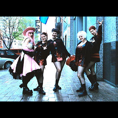 We crossed the street to the Frog Design party. Frog Design had the good taste to book the Flametrick Subs together with the Satan's Cheerleaders. What a fucking show! I'd forgotten how good it was to see them together. I had a fantastic time as can probably be seen from this image of me gettin' down with Lucky Dukes. (I wonder if Lucky was feelin' texy, 'cuz Tex was definitly feelin' Lucky!)