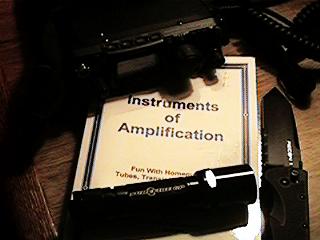 RIGHT: Some test equipment. Starting at the top row, we have from left to right: Radio Shack 22-805 PC Interface Multimeter, Radio Shack 22-310A ProbeScope, Aceco FC3002 Frequency Counter, Icom R-10 Receiver, and a Russian PKCB-104 Geiger Counter. The bottom row shows a Radio Shack 271-110A 10K Ohm Termistor, Optoelectronics M1 Frequency Counter, "Inductive Pickup" Microphone (Radio Shack et. al.), Radio Shack 277-1008C Mini Amplifier/Speaker, and a Digitmaster Pro Touch-Tone Decoder. The multimeter, ProbeScope, R-10 Receiver, and frequency counters are all capable of being hooked up to a PC for data acquisition and logging of various electric and electromagnetic signals. Similarly, the thermistor can be used with the multimeter for temperature logging. The Aceco frequency counter can be connected to the Icom R-10 for "reaction tuning", the detection and simultaneous monitoring of nearby "near field" radio signals.