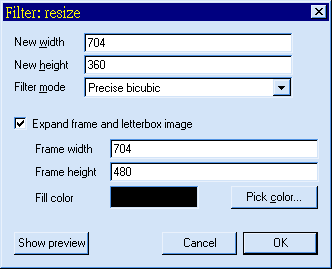 - Video -> Filters -> Add -> Resize Set as follows.