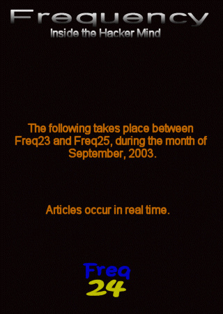In September of 2000, people who frequented the webboard over at www.undergroudnews.com probably read post after post from Screamer Chaotix talking about the new ezine he wanted to make. It was to be called Frequency: Inside the Hacker Mind and would deal with whatever was of importance to the hacker community. Each article would be written by hackers, and made for hackers. Several friends contributed, eventually creating the very first issue. It was sent out to only a few people, and found a homepage of it's own on a tripod hosted site.