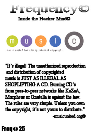 Welcome to the homepage of Frequency: Inside the Hacker Mind. This is our first stepping stone, and will hopefully have a domain name if this zine takes off. Frequency is a zine written with the true hacker in mind. It's not one would come to find a text phile on how to hack, but rather a place where real hackers can let their opinions be known. And as long as the zine is seen from that point of view it will be most enjoyable. Play it safe, but never stop exploring.