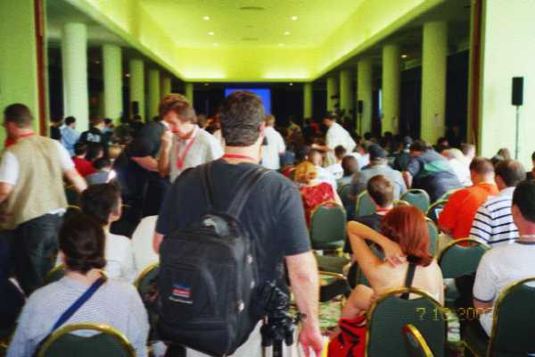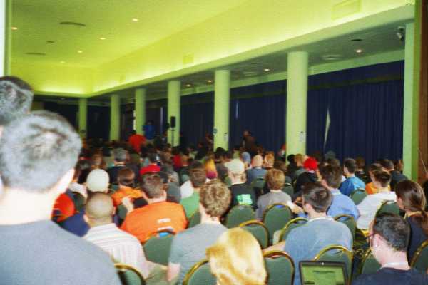 Emmanuel Goldstein, founder of 2600 magazine, from behind.. (red shirt)