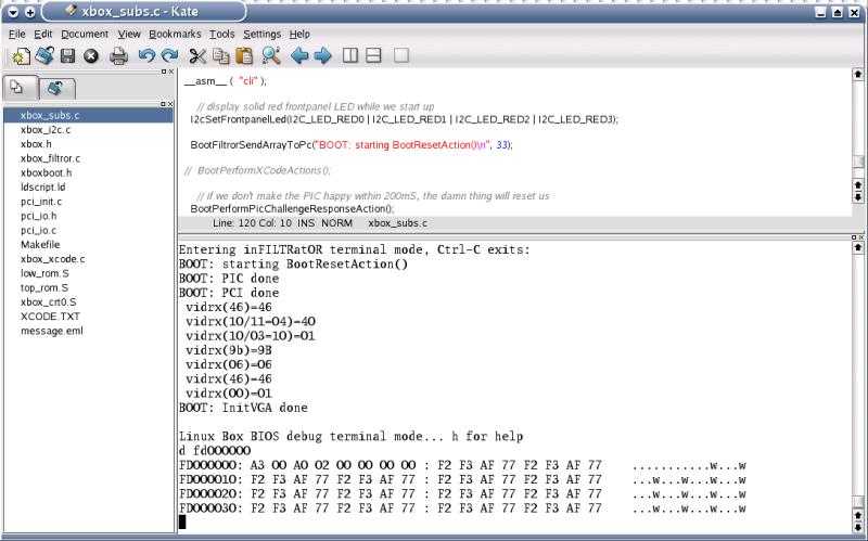 into the KDE Kate app, showing the Debugging app running in the X-Box bootrom.