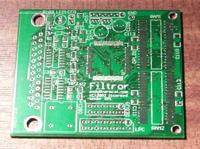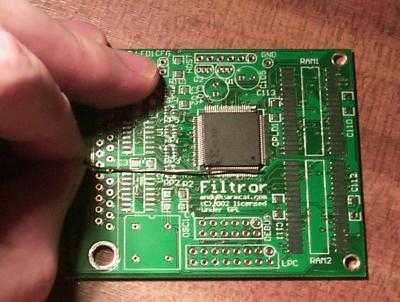 This beast roars a motor deafeningly, creating a vaccuum which sucks the solder and flux vapours through a purifying filter. I have a second black box, on the left of the picture, to filter anything that escapes. And still, even with these precautions, my work room stinks of solder and acid flux after a building session. I must have so much lead in me I am surprised I don't set off airport metal detectors. Anyway, please take some precautions not to breathe that stuff in, it will certainly give you some kind of horrible cancer if you get too much of it in you. Step 1: Position the deviceHere is the bare PCB.