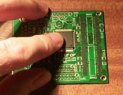 Step 2: Tack two corners with solderNo need to be too careful, but check your pin alignment AFTER THE FIRST blob of solder. You will still be able to adjust it. When you place the second blob, you are committed. Get it right.
