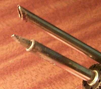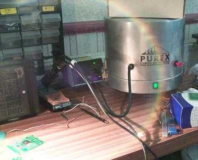 You might think you need a needle-pointed soldering iron for this fine work. Not at all. In fact a spade-head bit for your soldering iron is ideal, like mine pictured above. What is that metal tube on top? This is my de-cancerifying tube. As you can see below it is connected by a flexible pipe to a big silver machine made by Purex.