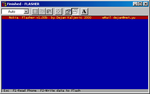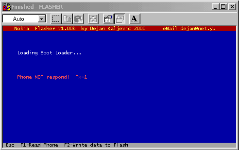 Sometimes it can happen that you get this what you can see on the left. When you get this, either you have not copied the correct f_loader.bin file into Nk_files folder or your connector is not properly attached to your phone. In this case check your connector because sometimes it can happen that one leg does not make a good connection on the phone. Connect the phone again to the flasher and if, after repeating all the steps, this happens again, copy a other f_loader.bin file in your Nk_files folder. In Nk_files folder you will find 8 folders with f_loader.bin files so you can experiment to find the right loader file for a specific phone. I work only with these 8 loader files and I have unlocked all phones that I had so don't give up. It will work. |