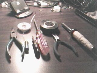As you can see, this includes needlenose pliers, wire cutters, assorted philips-head screwdrivers, electrician's tape, solder, desoldering braid, and a soldering iron with a fine tip. Use a low wattage iron to prevent getting the IC too hot.