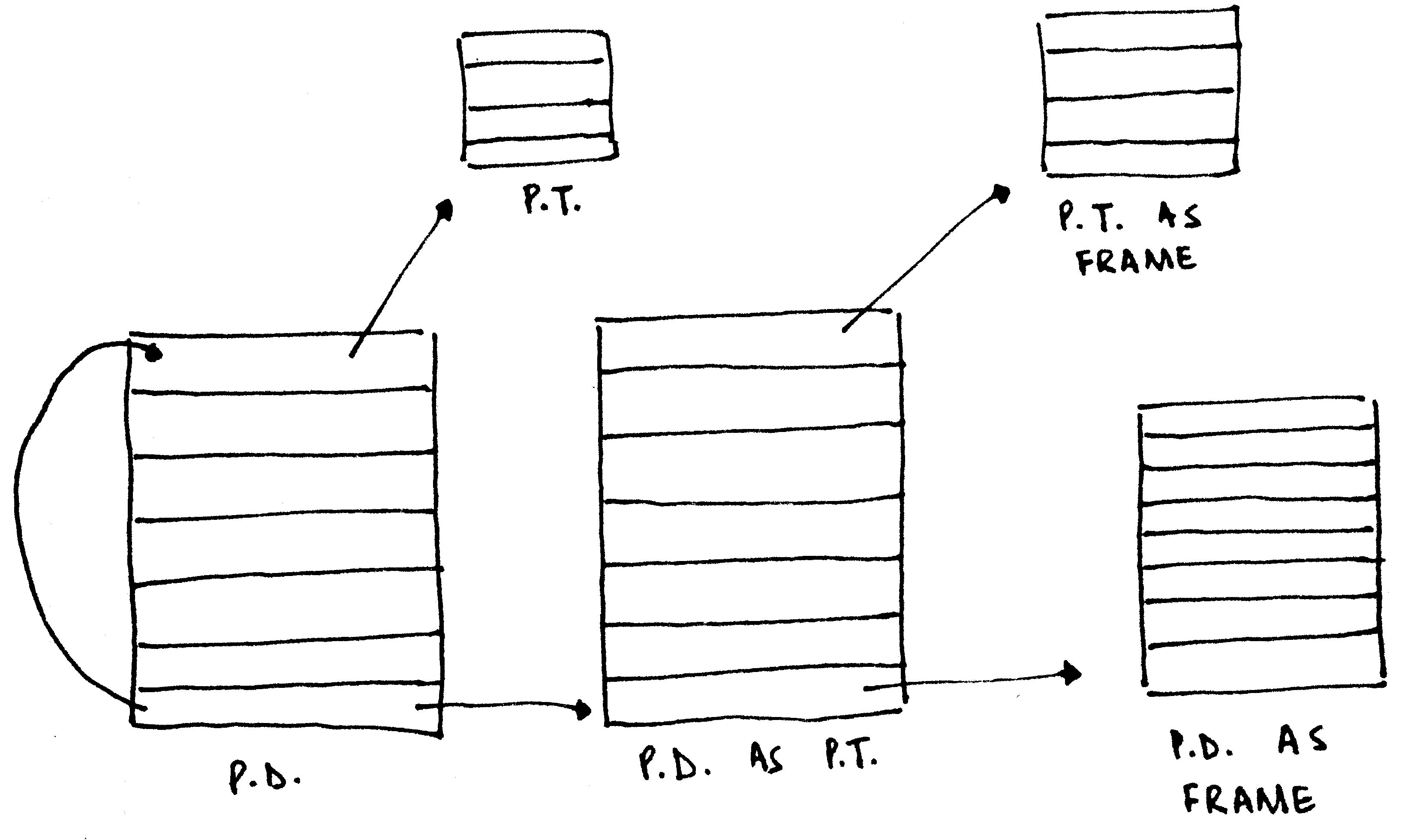 Before explaining the trick, note how the page directory and the page table has the exact same structure, including the attributes. What happens, then, if an entry in the page directory were to point to itself? The page directory will be interpreted as a page table. This 'page table' will have entries to actual page tables. However, the CPU will interpret them as entries corresponding to page frames, allowing you to access them via the virtual address the page directory was self-mapped to. If that makes your head hurt, the illustration above might help.