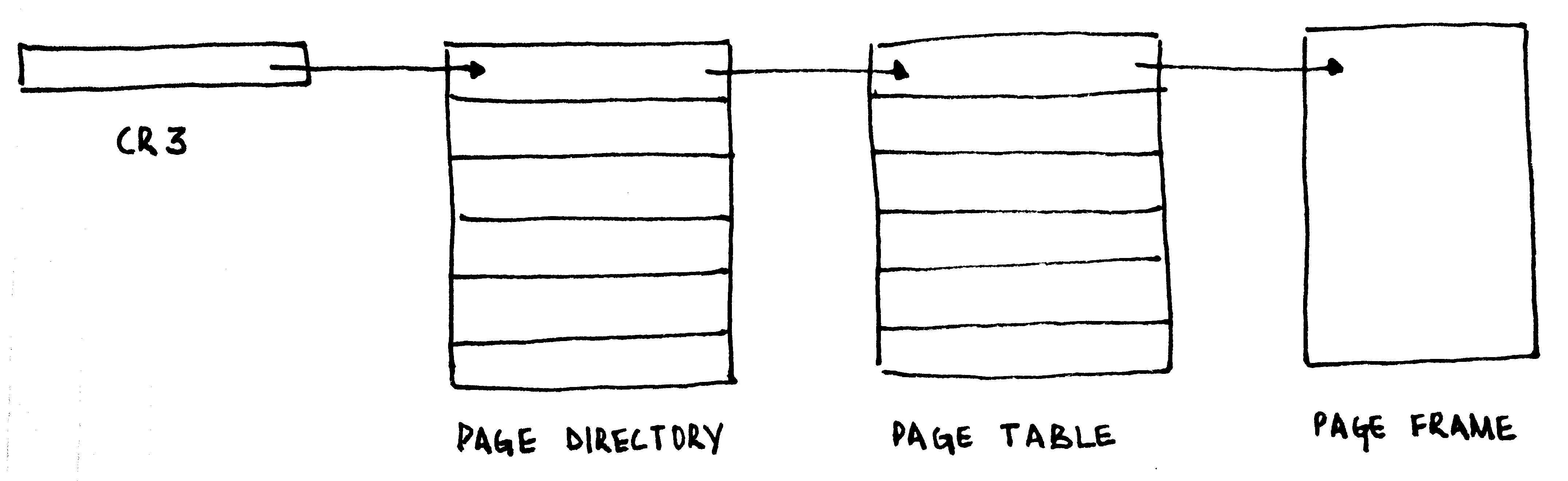 On the x86, the task of mapping virtual addresses to physical addresses is managed via two tables: the page directory and the page table. Each page directory contains 1024 32-bit entries, with each entry pointing to a page table. Each page table contains 1024 32-bit entries, each pointing to a 4KiB physical frame. The page table in entirety addresses 4MiB of physical address space. The page directory, thus, in entirety addresses 4GiB of physical address space, the limit of a 32-bit address space.