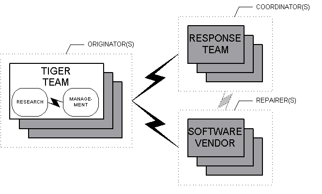 The discussion that follows will reflect the vulnerability process from the perspective of a vulnerability tiger team in the originating role. The activities and mutual communications of the coordinators and repairers are treated in less detail and are abstracted as black boxes (Figure 2).