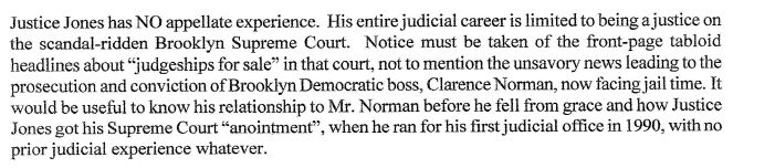 "Jones is an African American who practiced law with Clarence Norman, the Brooklyn Democratic Party boss subsequently convicted of accepting illegal campaign contributions. In 1990 Jones won election to State Supreme Court (he was re-elected in 2004), and in 2006 he was selected as Administrative Judge in the Civil Term in Queens." Source Judicial Reports