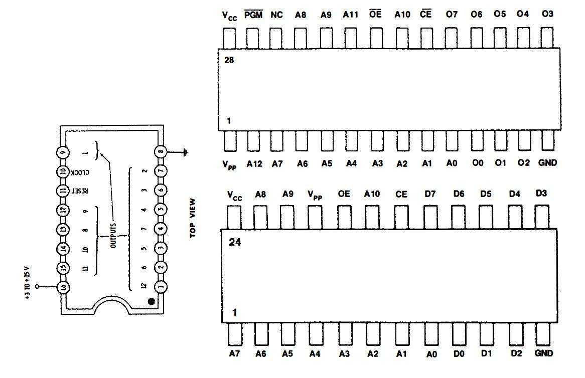 LU - Local Use Flag SCM - Station Class Mark GIM - Group ID Mark EE - End-to-End Signaling Flag REP - Speed Dialing (on/off) HA - Horn Alert Flag HF - Hand-Free Mode (on/off) PS - Preferred System Flag MIN1 - Mobile Telephone Number (7-digits) MIN2 - Area Code of Mobile Phone Number IPCH - Initial Paging Channel SIDH - System Identification for the Home System ACCOLC - Access Overload Class MIN MARK - Send MIN2 (on/off) LOCK CODE - Lock/Unlock CodeReading these chips is easily done with a small circuit which took me only 10 minutes to design and build using a CD4040 decade counter and eight LEDs (for the 8-bit output at each address). Pin-outs for the necessary chips are shown at the end of the article. When reading the PROM, use a toggle switch to cycle through each address, writing down a "1" or a "0" for the output of each bit. It seems like a tedious task but it works.