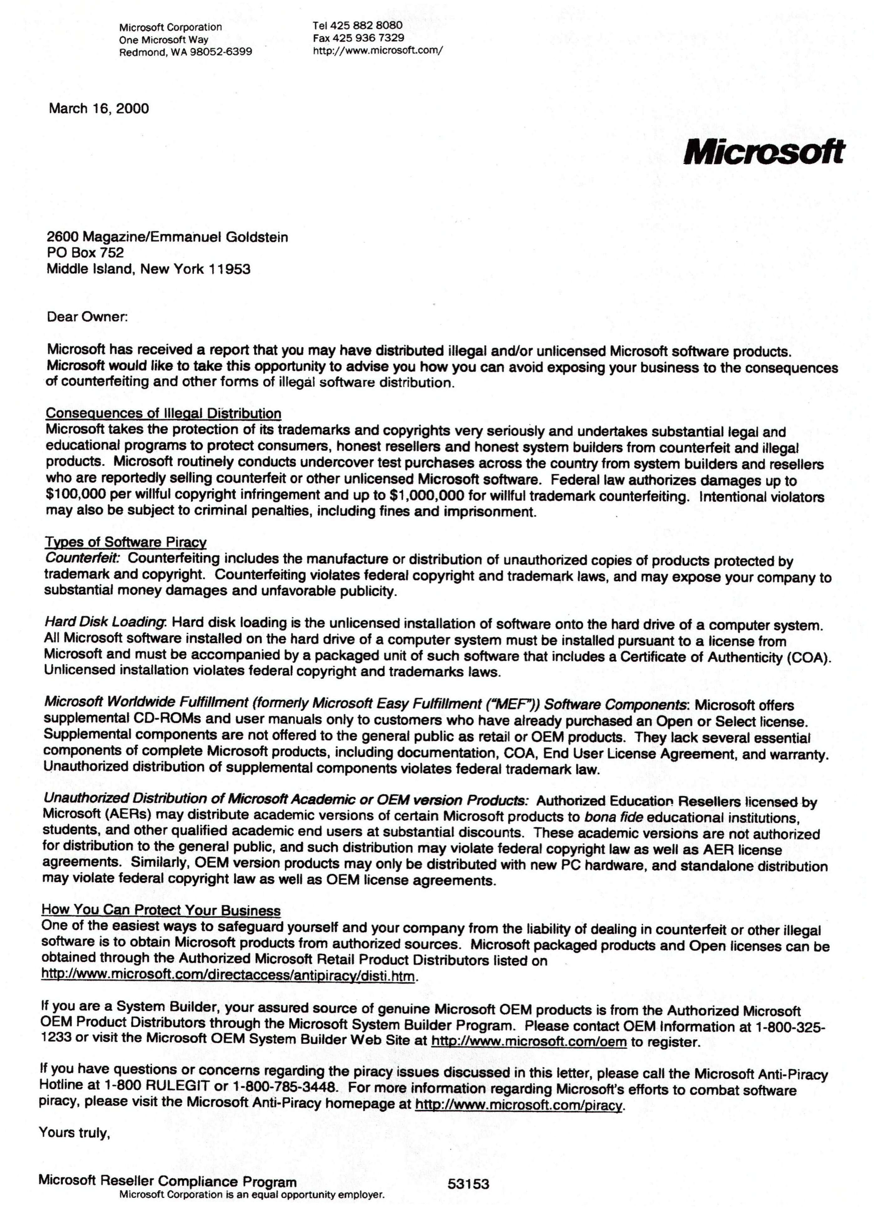 Microsoft decides to just accuse us of software piracy out of the blue. We have better things to do besides use, much less spread, Microsoft products.