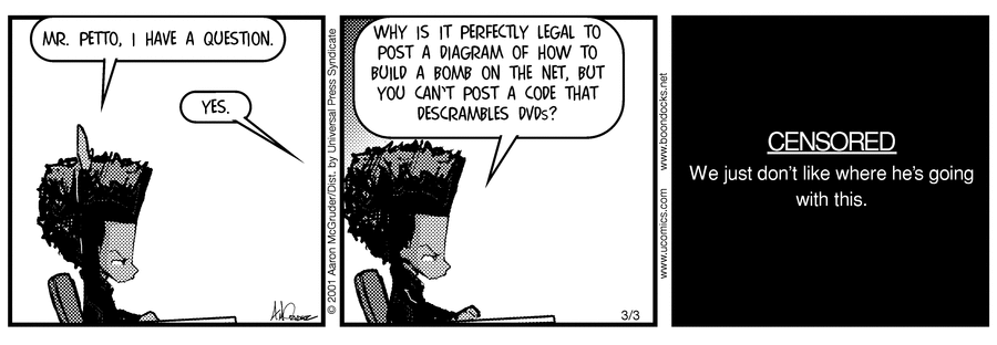 On a different day, the entire strip was replaced with the words: "CENSORED. This comic contains numerous references to the DeCSS code used to bypass the Content Scrambling System of DVDs, which, by order of Judge Lewis Kaplan, is illegal to reproduce in any way. We apologize for the inconvenience, but speech that damages the profits of our corporate friends is NOT protected by the First Amendment. Thank you."