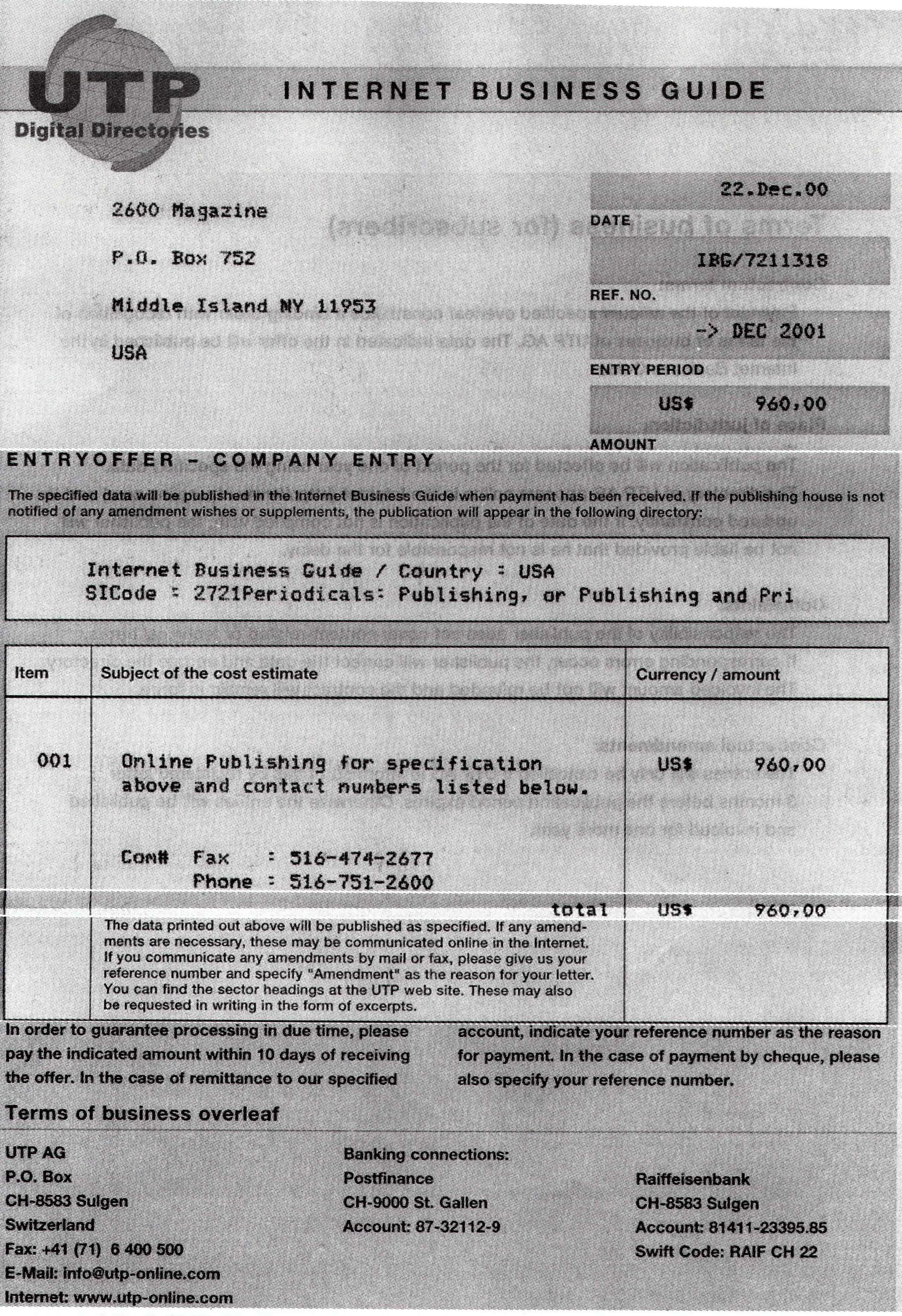UTP, along with another Swiss company called IT&T (www.ittag.com) have been sending these little swindle applications to the listed address for every Internet domain we registered through Network Solutions, Inc.