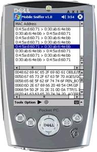 AirScanner is a great Pocket PC sniffer program. It has the ability to sniff many different varieties of packets and can easily pick up something useful. It is also possible to filter the type of packets which you are sniffing, thus narrowing the search for what you're trying to pick up.