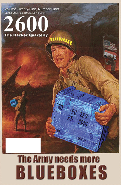 The message at the bottom says "The Army needs more BLUEBOXES" which was a reference to the Blue Boxes of phone phreaks.
