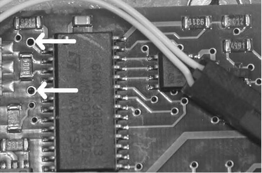 - Locate the reset jumper holes. There's a central 28-pin surface-mount IC. If you hold the lock with the bolt facing away from you, the jumper holes are directly to the left of that IC. They're larger holes than the rest, and they have exposed tinning around them. They're about a quarter-inch apart. See Figure 1 and Figure 2.