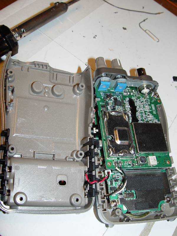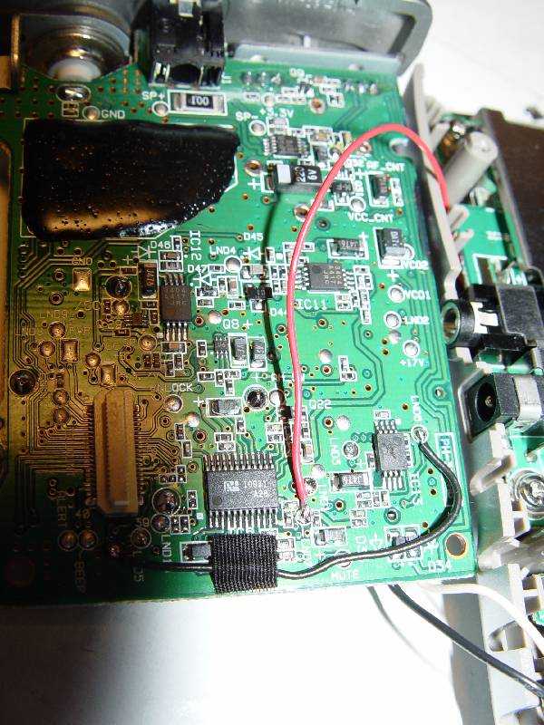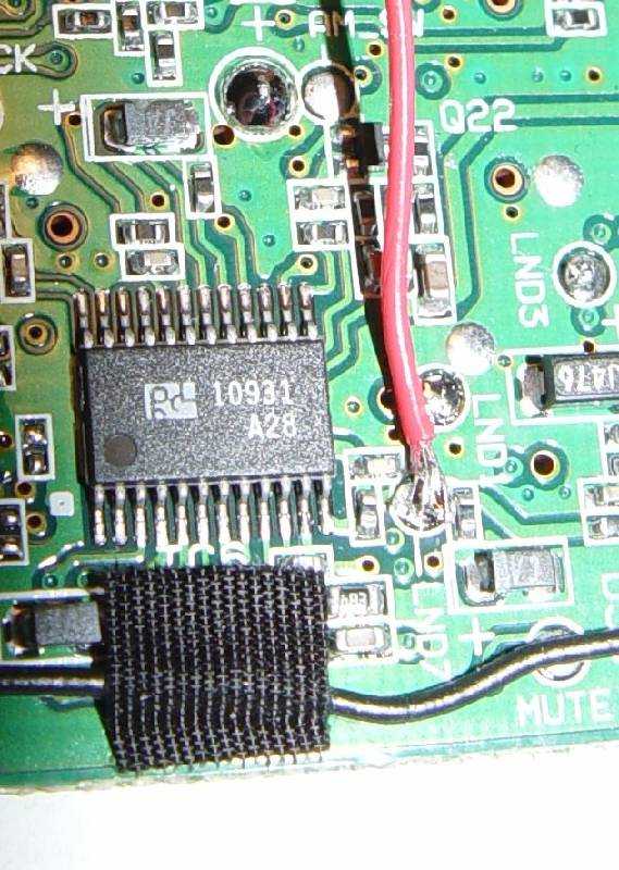 The other end of the wire goes to the tap point, which is labeled "LND7" on the back of the top-most board, just to the right of the discriminator chip. This is the delicate bit, as the solder point is very small. Take your time here. Having made the contact, reconnect the top-most board, reconnect the battery compartment, and reassemble the unit. The mod is complete!
