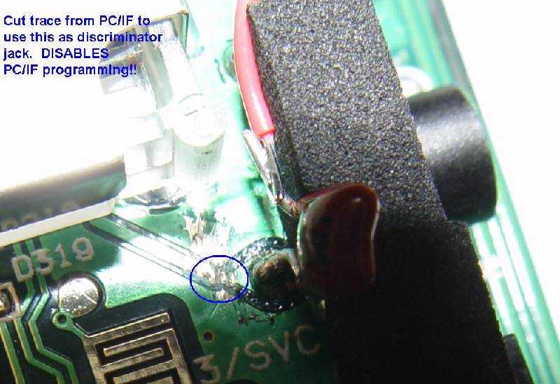 All that needs to be done to modify the PC/IF port of the PRO-83 to be a discriminator tap rather than a PC/IF port is to cut one trace on one board, and solder a capacitor from one point on the board to another point on the other board.