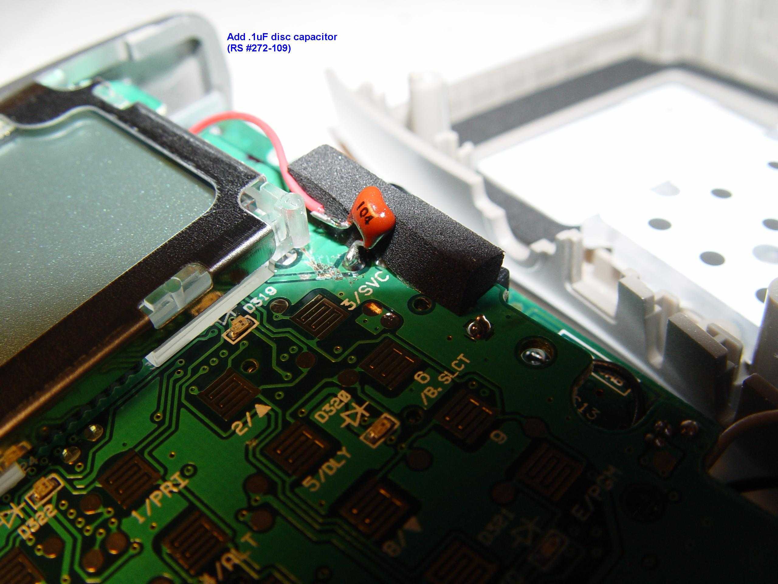 Having pulled out the back board, you can clearly see the trace going to the PC/IF port. It's right above the silk-screened label for the 3/SVC button on the backside of the back board. You'll want to cut this trace and solder a capacitor to the side of the cut still connected to the PC/IF port.