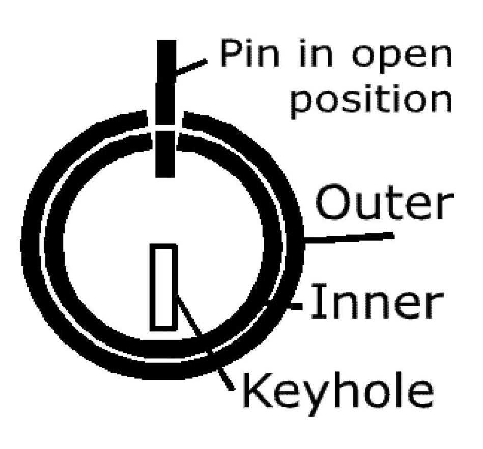 Locks have a number of pins (around five for a house key) that are split in one of (usually nine) positions along their length which are spring-loaded to interrupt the rotation of the mechanism (see Figure 1a and Figure 1b for a simplified look).