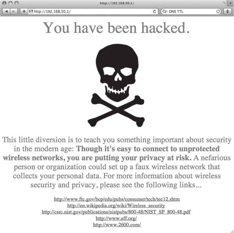 Again, the point of this honeypot is to educate the user about the pitfalls of unknown, unprotected wireless networks and privacy on the Internet in general. Spend some time writing up a web page that explains why the user didn't end up where they expected on the web and why they might want to consider approaching their Internet experience with more caution in the future.
