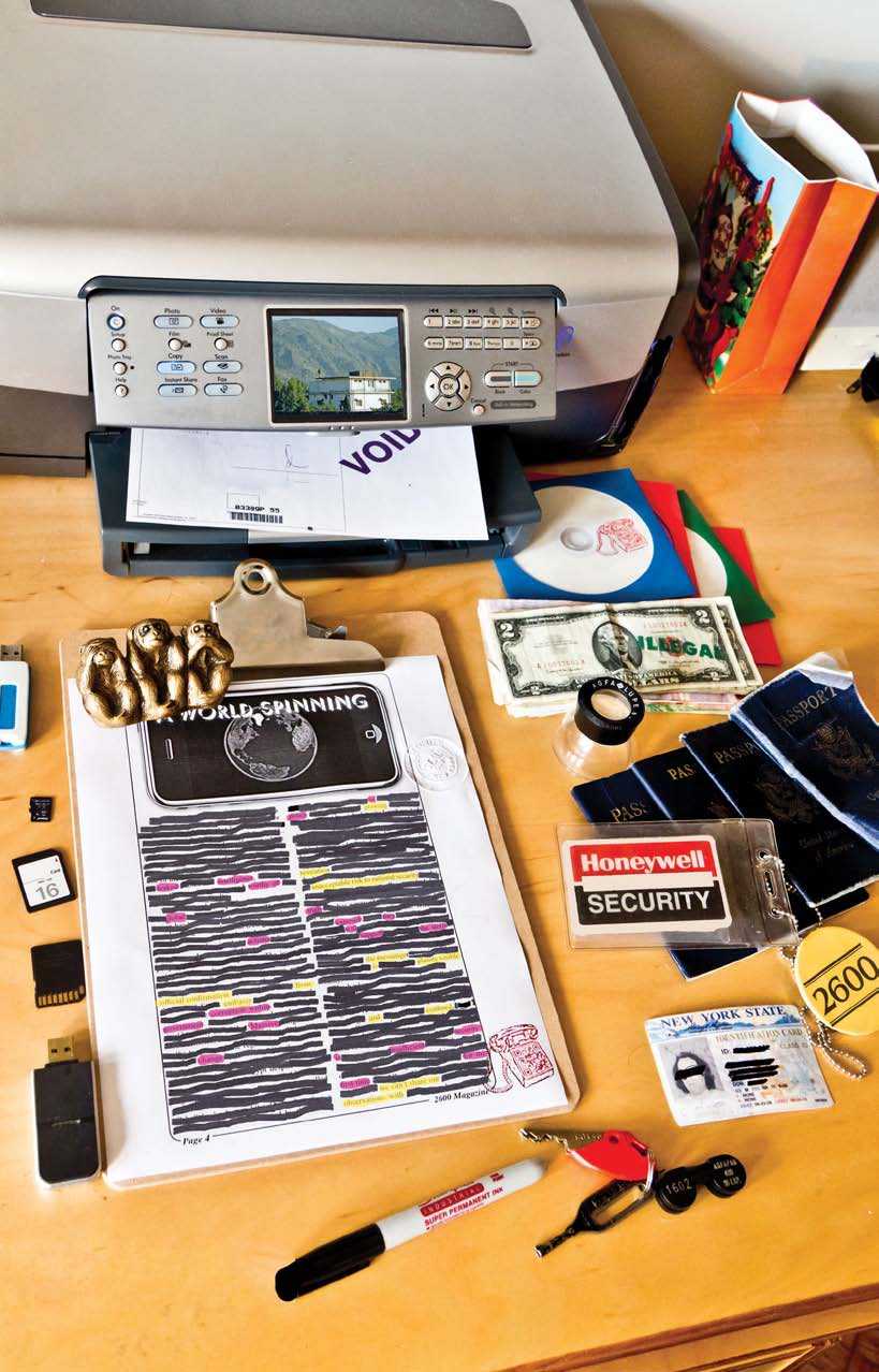 Surrounding the clipboard are these items: flash drive, microSD card, SD cards, USB fingerprint scanning dongle, $2 bills stamped ILLEGAL, an 8x magnifier loupe, a collection of counterfeit passports, a Honeywell Security proximity badge (redacted), a New York State driver's license (redacted and censored), an industrial strength Sharpie marker, a secure bump-proof key, a handcuff key, Minox spy camera film, a 2600 pin from the 1980s, and a colorful and secret paper bag.