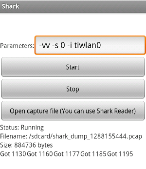 With the Wi-Fi interface name in hand, you can start up Shark and add in the proper tcpdump parameters. To specify a different interface from the default, you use the -i option, so add -i tiwlan0 to the parameters already listed in Shark (substituting your particular Wi-Fi device name, if necessary). Then press "Start", and make sure it begins logging packets.