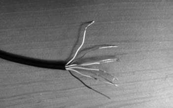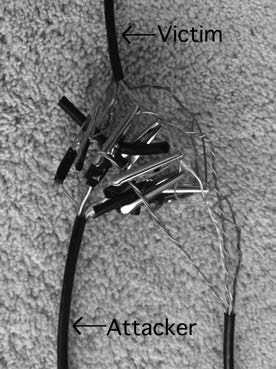 To begin the attack, you need to strip the victim's Cat 5 cable (all individual wires) down to the metal without cutting it. Tricky - it takes patience and finesse. After the metal of all the wires has been exposed, you can connect the attacking cable's alligator clips to the victim's exposed metal wires.