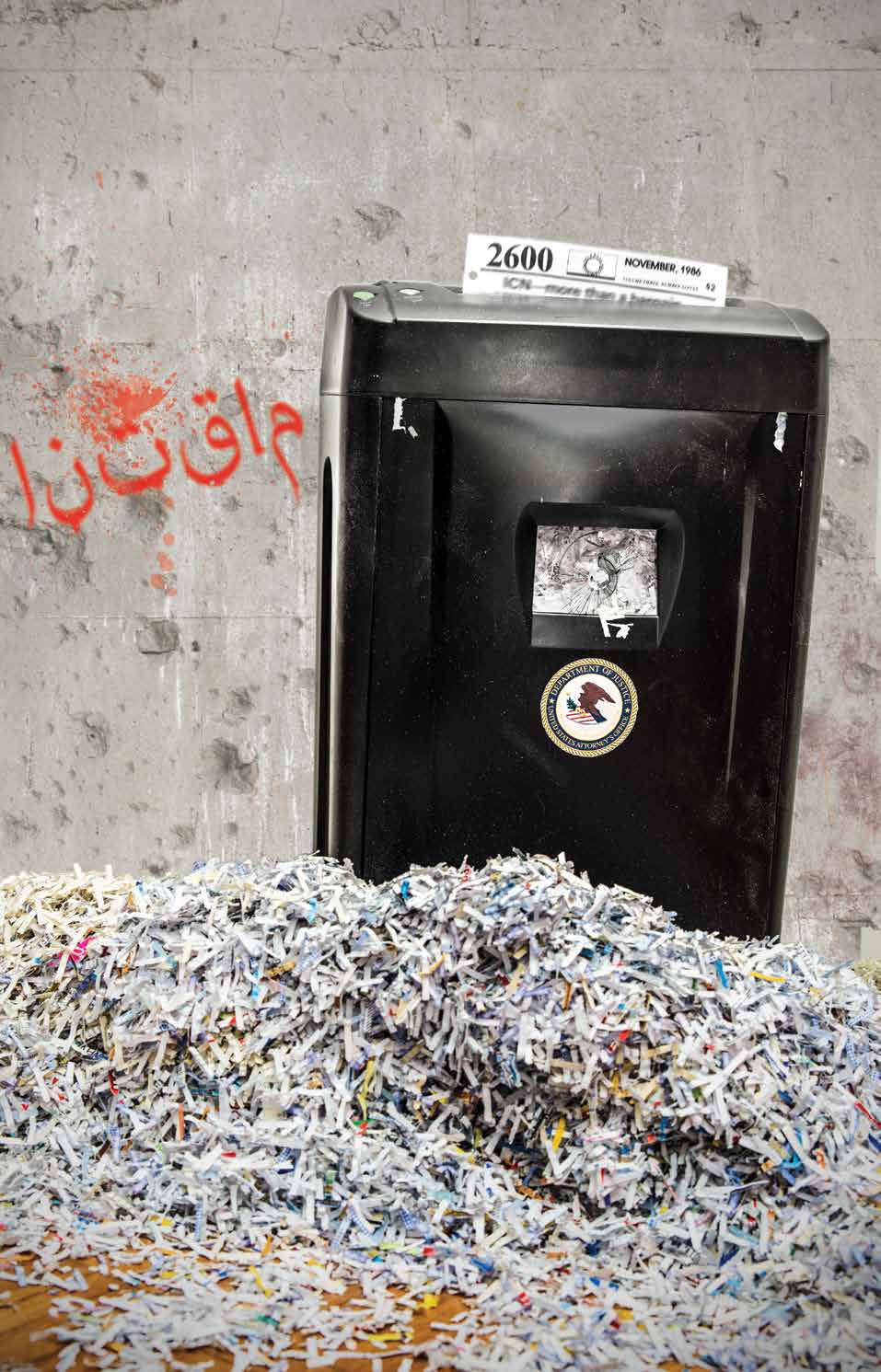 There is a bullet hole in the window of the machine, as well as several on the cement wall behind it. The November 1986 issue of 2600 is being shredded. This was to commemorate the month that hacker/activist Aaron Swartz was born. Swartz committed suicide in January after being relentlessly tormented by that same government agency.