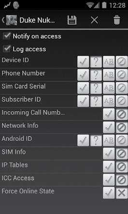 For this example, I used a pretty simple policy. If it is possible to set it to random (Device ID, phone number, etc.), set it to random, otherwise set it to deny. I also set it to log and notify for access requests. Here is a quick screenshot of the full permissions for the application.