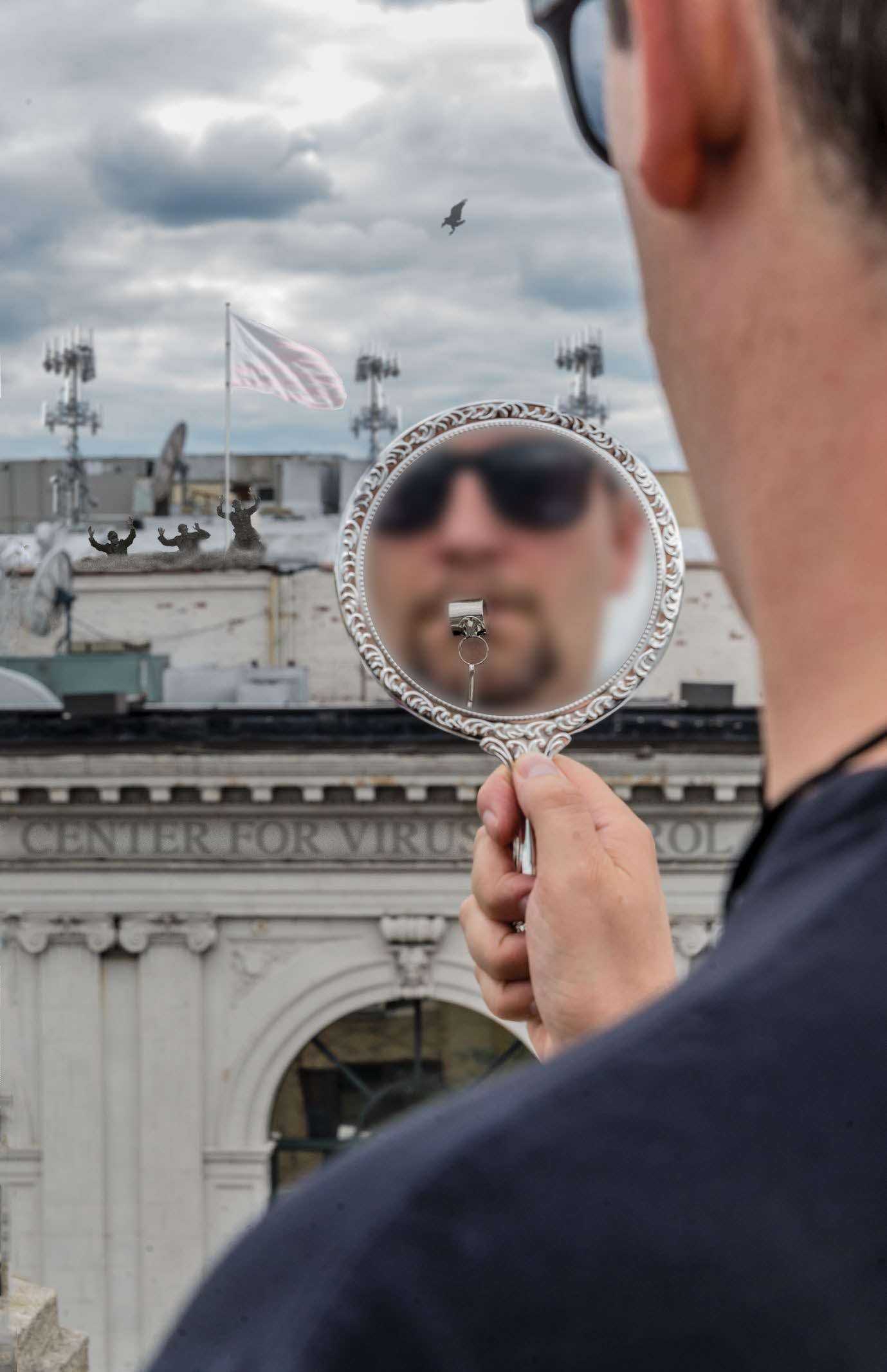 This cover has the obscured face of a literal whistleblower in a hand mirror.