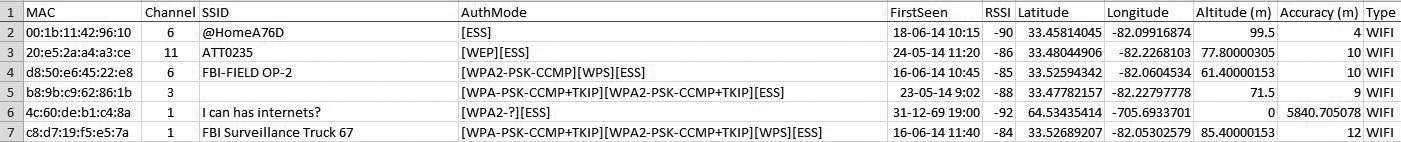 These are the cellular towers that WiGLE logs, and I don't have any use for them (yet). Removing them will leave only Wi-Fi APs that WiGLE has discovered, located, and recorded. Custom sorting the rest of the data by "AuthMode" will let you easily identify APs based on their protection. Seeing only "ESS" means it's an open network (no password required and no encryption).