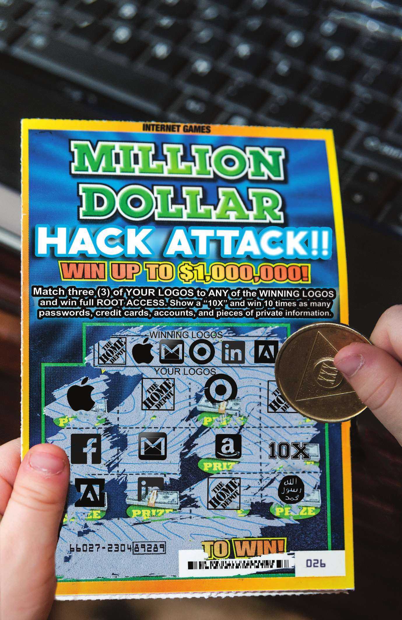 This cover features a child's hands holding a scratch-off Lotto ticket highlighting some of the largest profile corporate database hacks in recent months: Home Depot, Apple, Gmail, Target, LinkedIn, and Adobe.