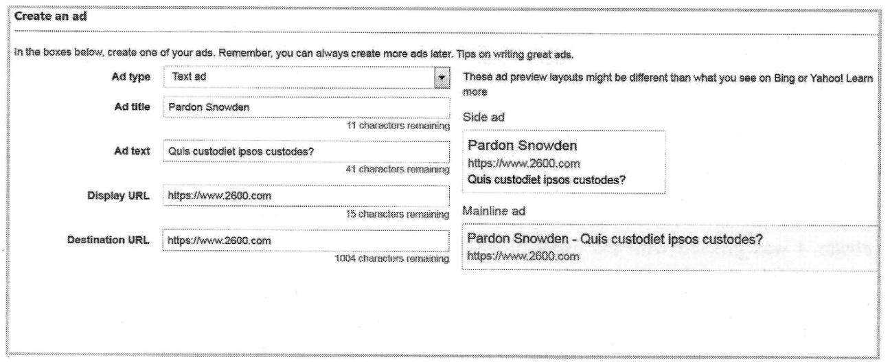 Bing Ads has some advantages price-wise, in addition to being the default search engine in Internet Explorer. (There are plenty of tutorials online to show you how to use both Bing Ads and Google AdWords.) Non-tech-savvy users are more likely not to change the default search engine. They are also more likely to click on search engine advertisements that look similar to legitimate search results. In this case, we do not really care about getting the law enforcement agents or police officers to click on the ads, so much as we want our ads shown when these law enforcement agencies search for our advertisements. These are called "impressions" in online advertising speak.