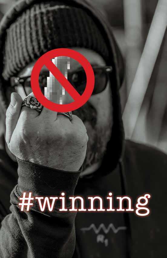 There is a resistor symbol on his hoodie (a reference to the resistance movement currently spreading throughout the country) and the image has the hashtag "#winning" along the bottom, a sarcastic allusion to the accomplishments so far of the new administration.