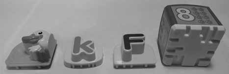 The block bottoms feature patterns that press a subset of eight buttons, arranged in two rows, on the Cookie Monster base. Each block can be positioned in four different orientations, with the outward-facing side corresponding to the sound played.