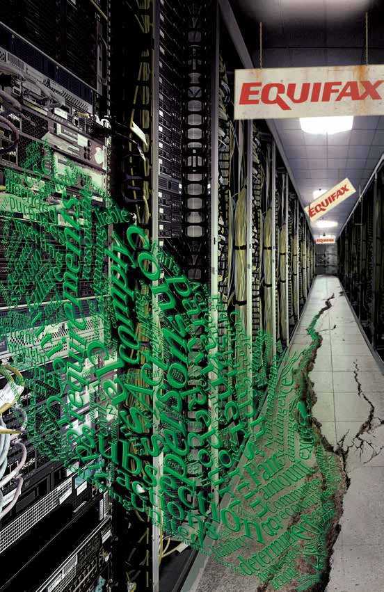Winter: The Equifax Breach. We see a dark and dingy data center with Equifax signs throughout.