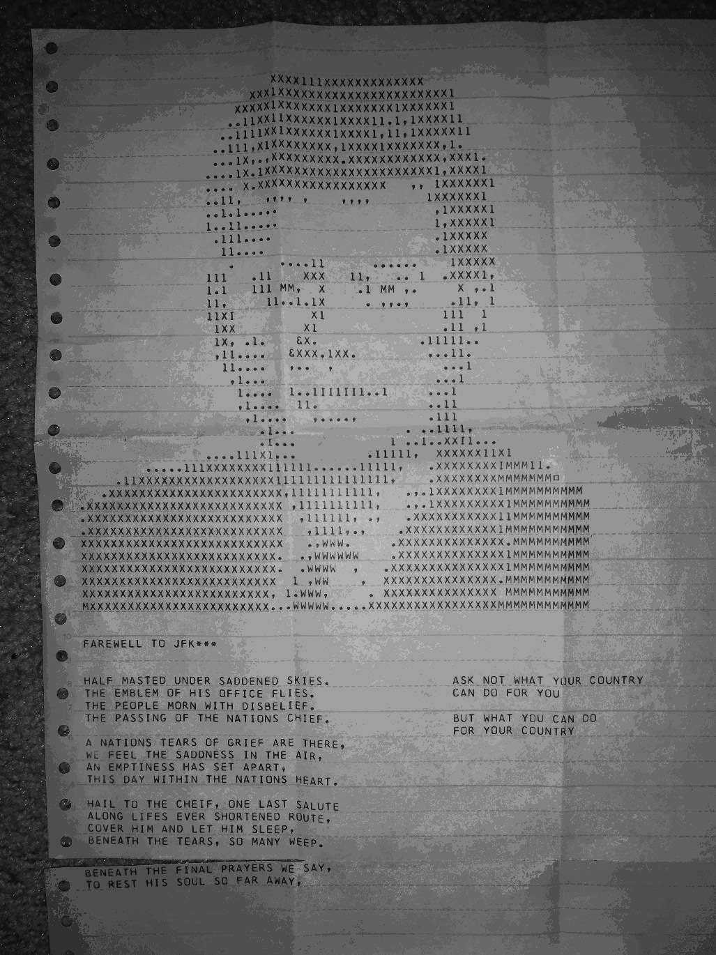 From that start, we found we could go the university's computer room and run programs there, so we had quite a lot of fun in those days running printer art. This was made by using a series of characters (and white space) to print a picture that from afar would look like something (such as a nude female or a picture of President Kennedy).